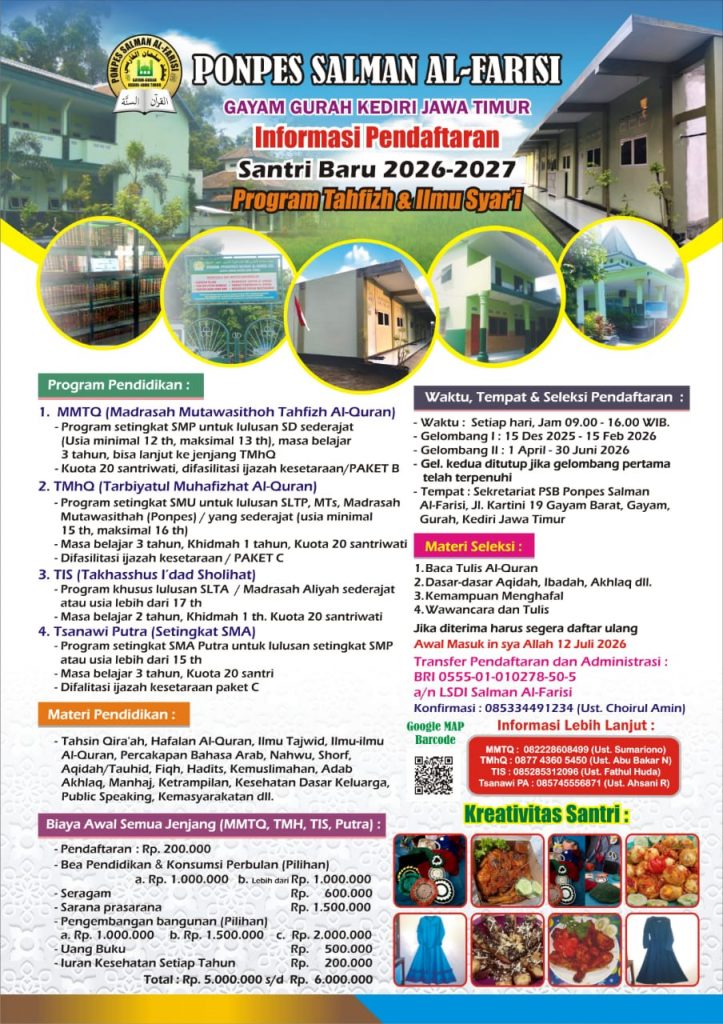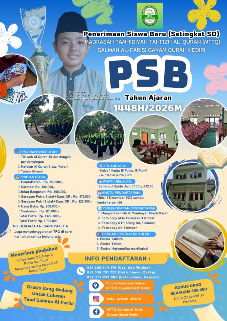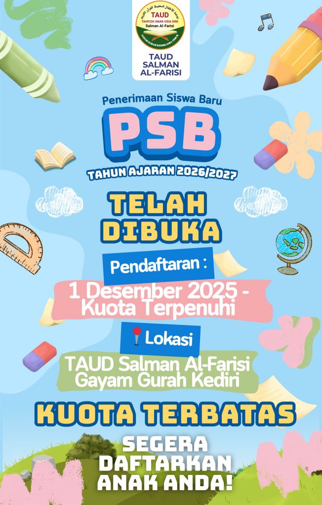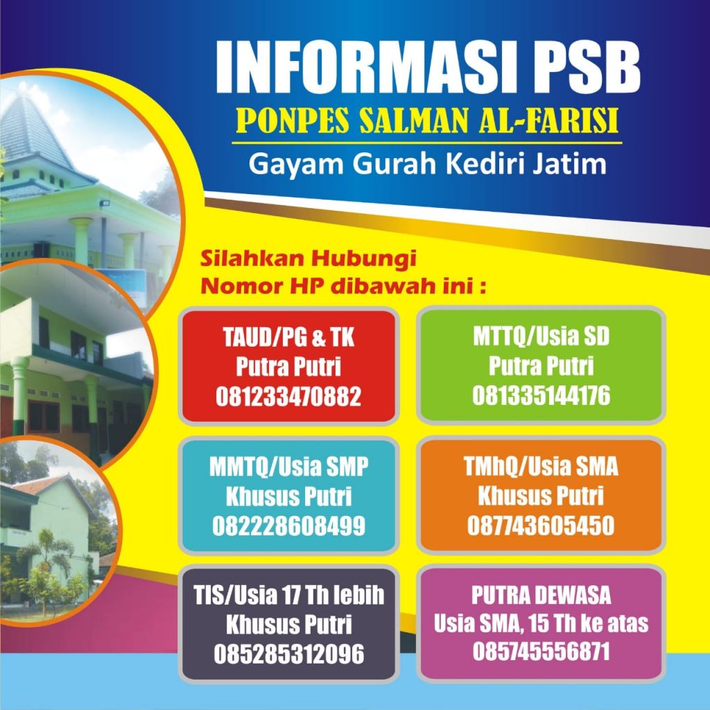 – Tempat: Sekretariat PSB Ponpes Salman Al-Farisi Gayam Barat, Gayam, Gurah, Kediri Jawa Timur https://goo.gl/maps/Vov1uFHZxsE2